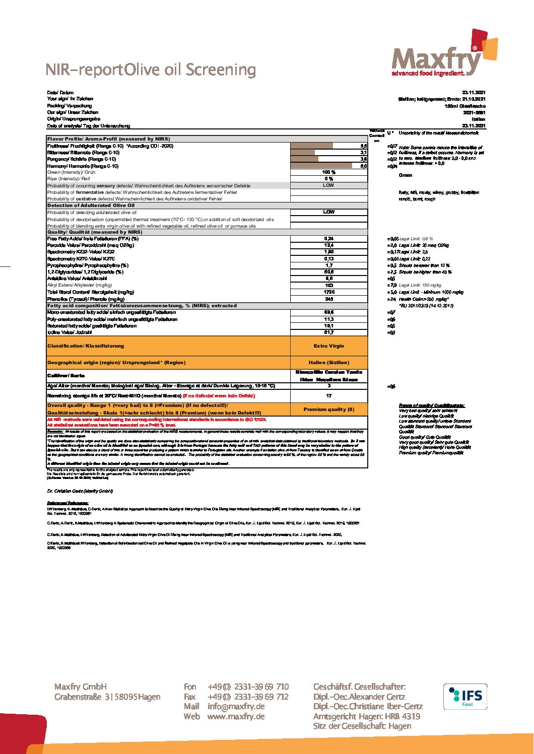Wir haben unser Olivenöl Mozzafiato – Olio extra vergine d ́oliva vom renomierten Maxfry Institut untersuchen lassen: